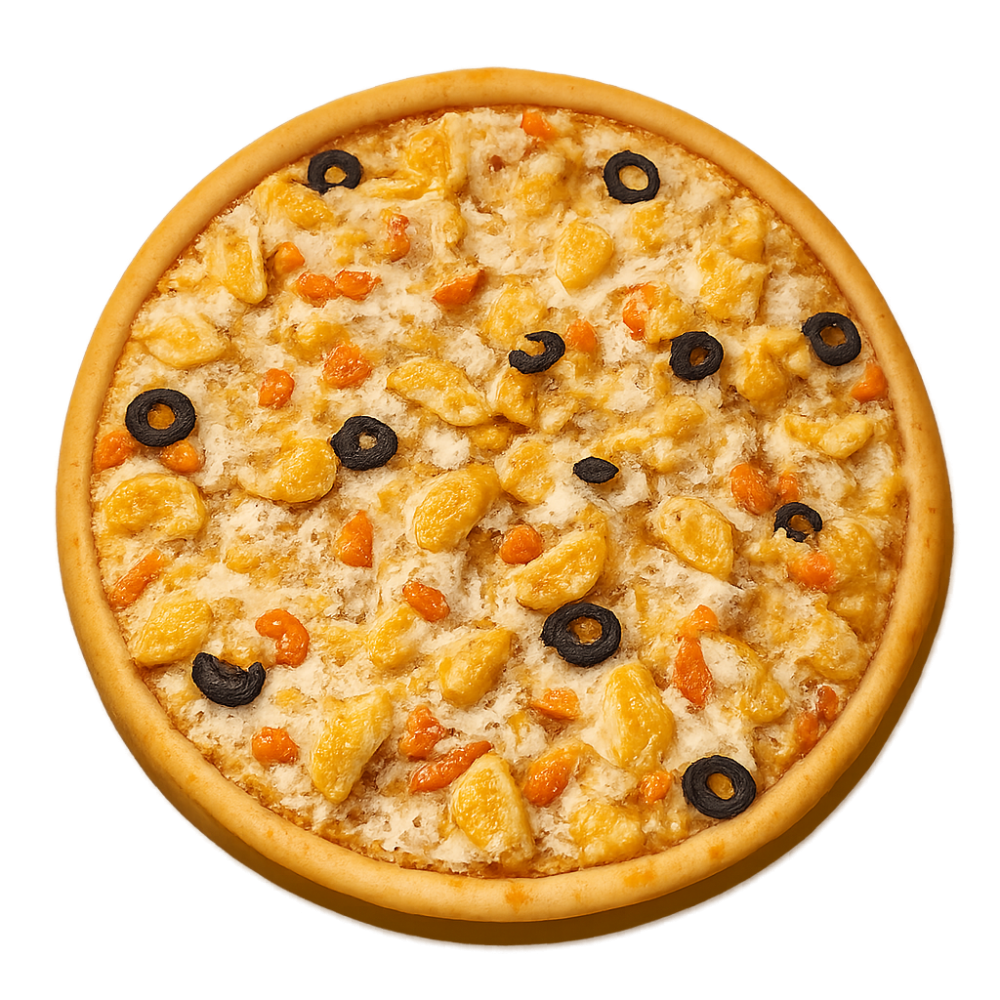 Соус "Сливочно-чесночный", моцарелла, курочка, мандаринки, томат, маслины, смесь сыров, соус "белый"