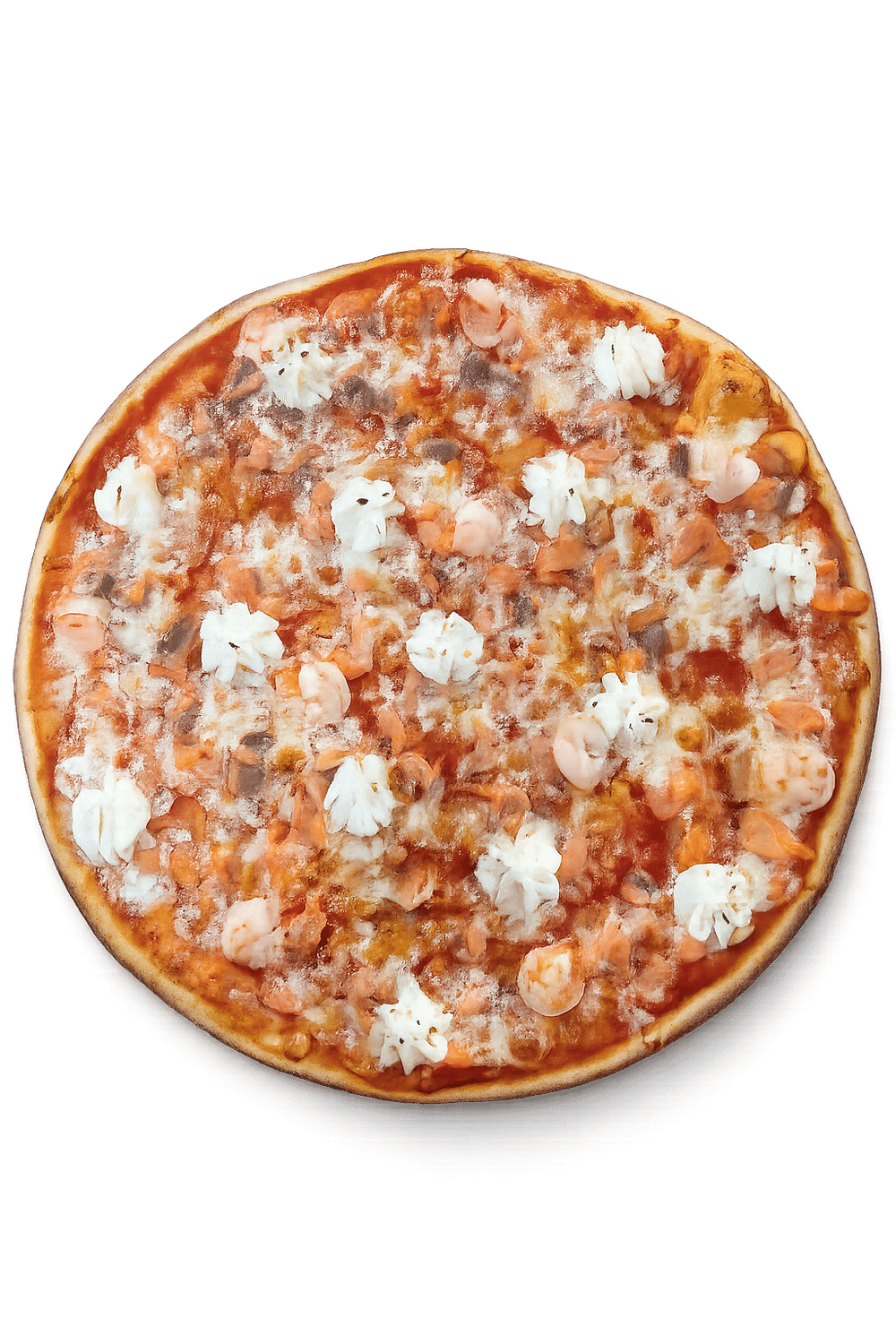 Пицца-соус, моцарелла, лосось, креветки, кремчиз, кунжут, соус терияки
